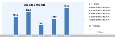 武汉高质量发展指数有5个一级指标,创新驱动指数累计增长14.2%,增长幅度在五个领域之首;绿色发展指数累计增长12.9%,提高显著;提质增效指数累计增长8.5%;民生保障指数累计增长8.5%,与提质增效指数保持同步;风险防范指数累计增长8.7%。2017年,风险防范指数达到五年来最佳水平。