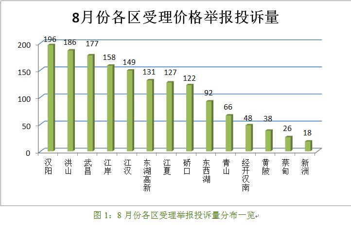 8月份价格举报投诉受理量居前列的各区依次是汉阳(196件)、洪山(186件)、武昌(177件)、江岸(158件)、江汉(149件)、东湖高新(131件)。