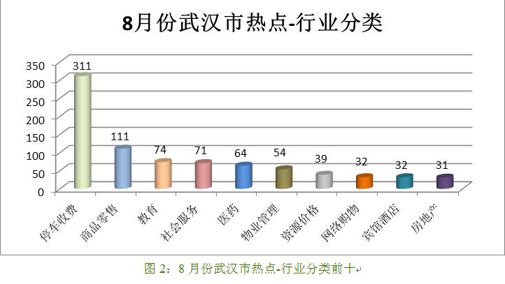 8月全市受理量较高的行业分别是停车收费、商品零售和教育等。相关情况如图2所示。