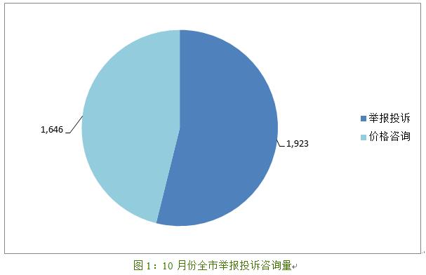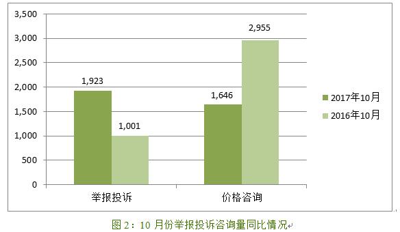 (一)价格举报咨询总量比去年同期减少10%。2017年10月,全市共受理价格举报投诉、咨询共计3,569件。其中,价格举报投诉1,923件,同比增加92%;价格咨询1,646件,同比减少44%。市价检局12358受理价格举报投诉614件,解答价格咨询1,454件。