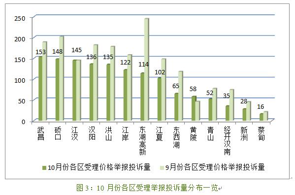 (二)价格举报受理量地域分布情况。10月份价格举报投诉受理量居前列的各区依次是:武昌区(153件,与上月相比减少19%,下同)、硚口(148件,增加27%)、江汉(145件,持平)、汉阳(136件,减少25%)、洪山(135件,减少24%)、江岸(122件,减少23%)。