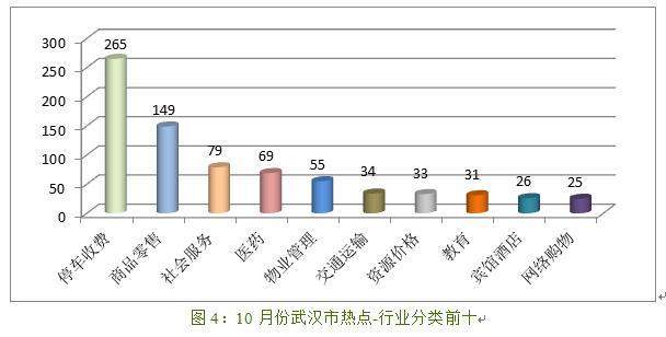 (三)停车收费、商品零售等行业仍然是关注热点。10月全市受理量较高的行业分别是停车收费、商品零售和社会服务等。相关情况如图4所示。