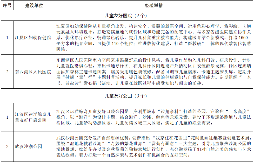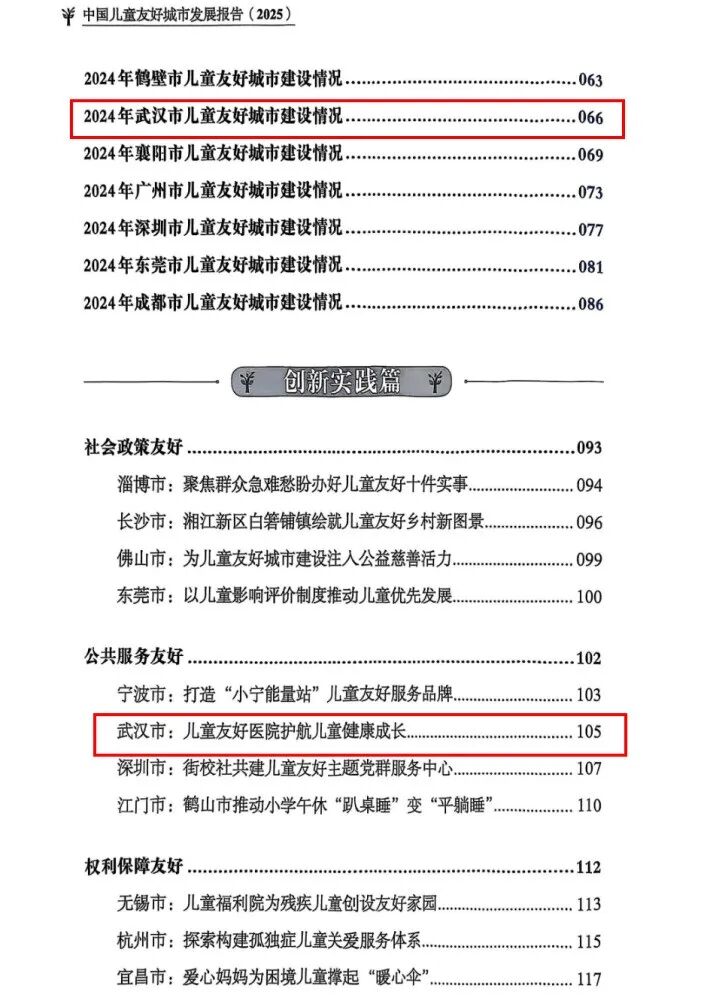 本次入选《中国儿童友好城市发展报告(2025)》的两项武汉经验是【友好推进篇】“2024年武汉市儿童友好城市建设情况”、【创新实践篇】“武汉市:儿童友好医院护航儿童健康成长”。