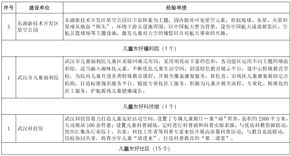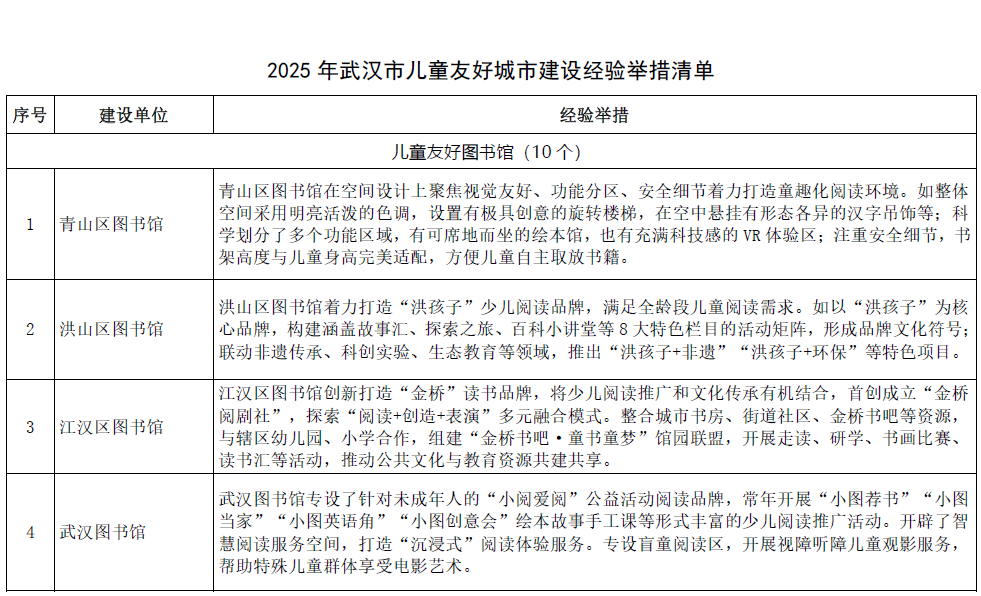 11月4日,武汉市印发《2025年武汉市儿童友好城市建设经验举措》,先后出台了一批增进广大儿童及家庭福祉的政策措施,建成了一批让群众切实可见、可感、可知的儿童友好空间,涌现了一批可复制可推广的经验做法,其中儿童友好图书馆(10个)、儿童友好医院(2个)、儿童友好公园(3个)、儿童友好福利院(1个)、儿童友好科技馆(1个)、儿童友好社区(15个)。
