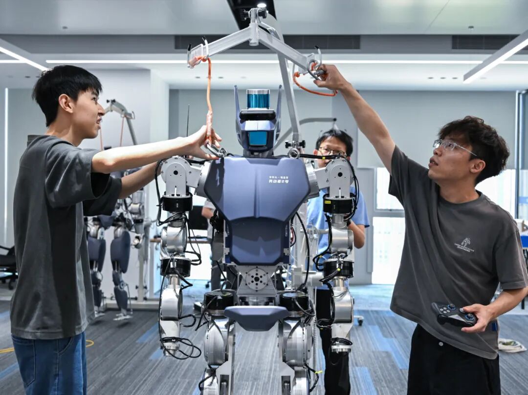 武汉格蓝若智能技术股份有限公司内,“劳动者”系列人形机器人准备进行调试。新华社记者杜子璇 摄