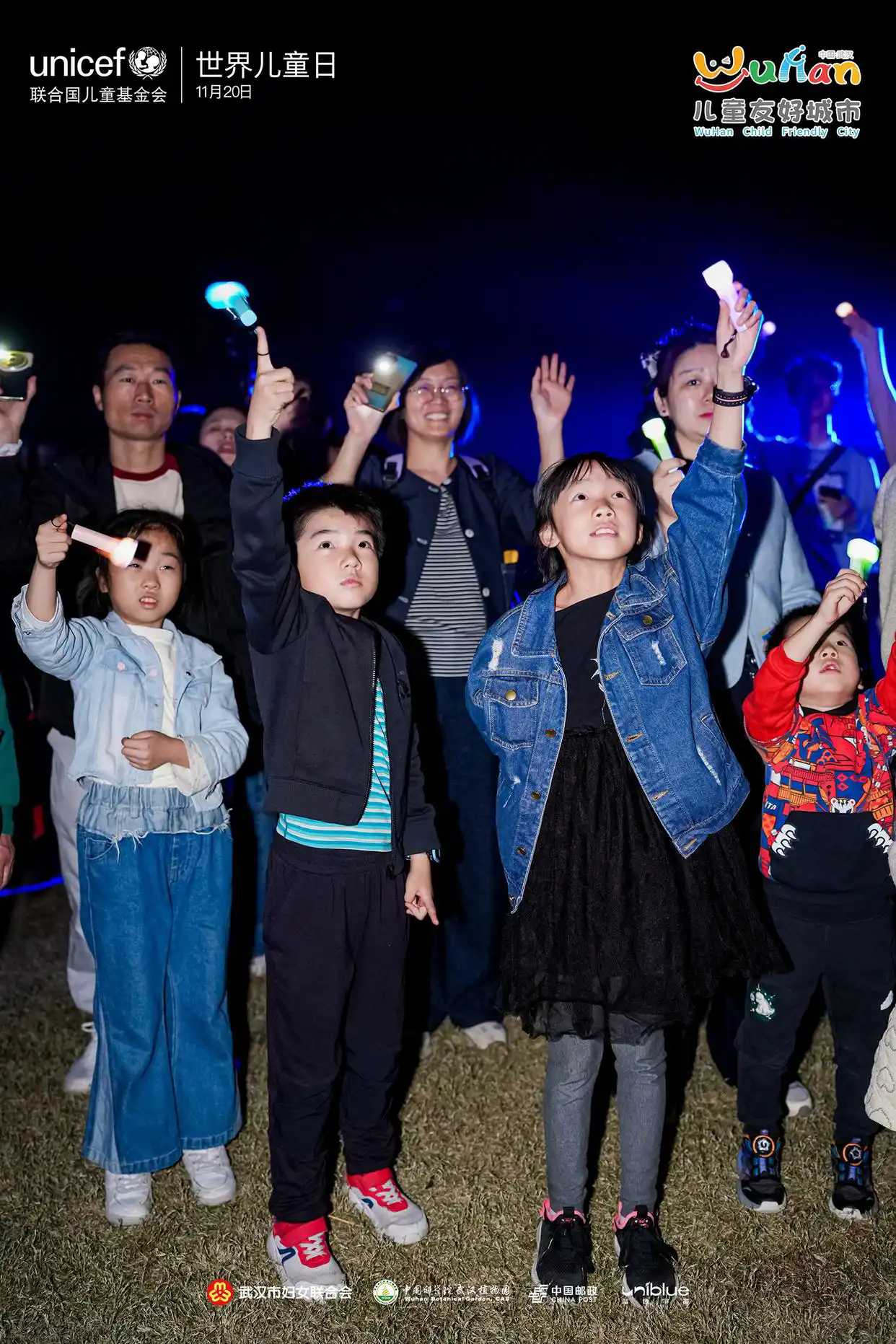 夜幕降临,所有人都围聚在星光森林周围,打开手机、打开手电筒,共同挥舞,如同万千星光。倒计时结束,孩子们一起大喊:“点亮武汉!点亮未来!”,全场的灯光瞬间被点亮,蓝色的灯光透过成千上万个塑料瓶发生柔和的折射,整个“WUHAN”符号变得通透、璀璨、光芒四射,象征儿童梦想点亮城市未来;瓶中的字条在光线的映照下,形成斑驳的阴影,仿佛那些梦想和承诺在光芒中飞舞,让世界看见未来的模样。仪式上,全体参与者共同宣读了《给未来的环保誓言》。随后,所有写满期许的信件被郑重存入特制的时间胶囊内封存,相约至2035年11月20日开启,以此见证时光流转中梦想的成长与城市的变迁。