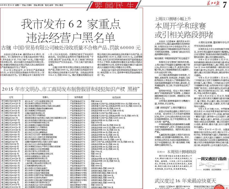 近日,市文明办、市工商局发布62家重点违法经营户黑名单,其中企业27家,个体工商户35家。古驰(中国)贸易有限公司、武汉东湖万达精品百货有限公司、锦江麦德龙现购自运有限公司武汉洪山商场因存在产品质量违法行为上“黑榜”。