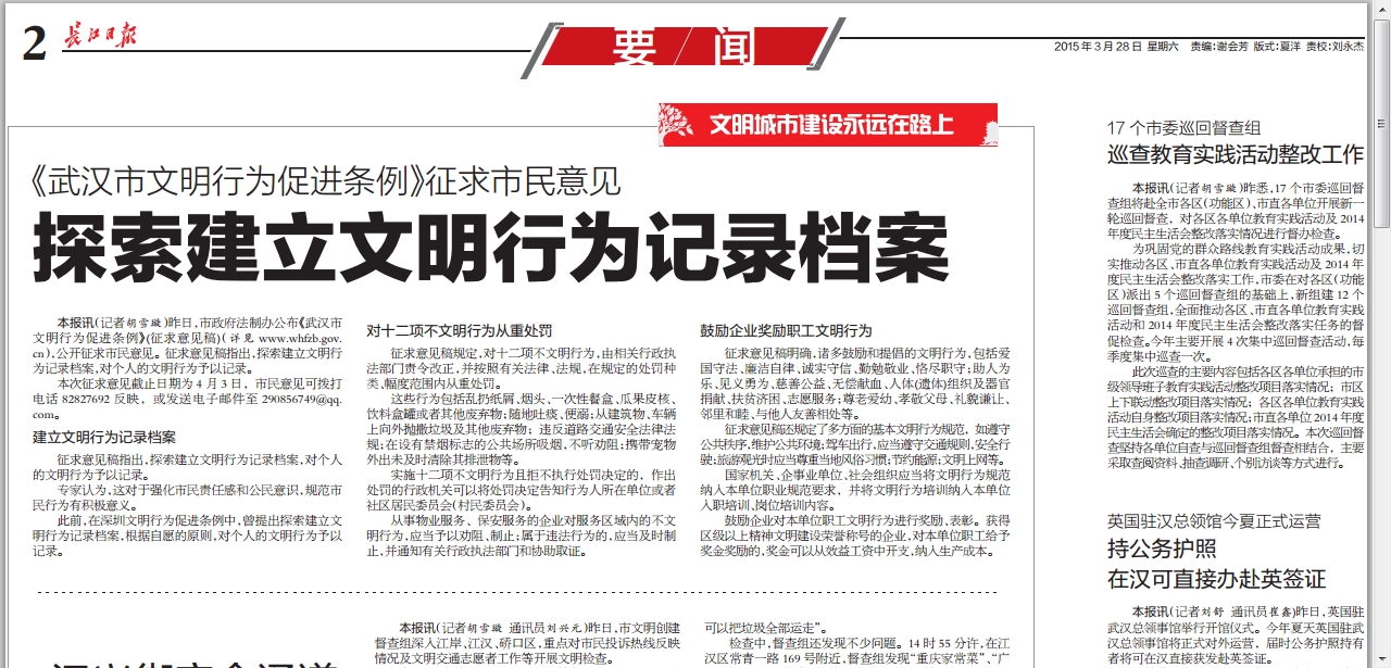 信用体系建设动态——探索建立文明行为记录档案《武汉市文明行为促进条例》征求市民意见