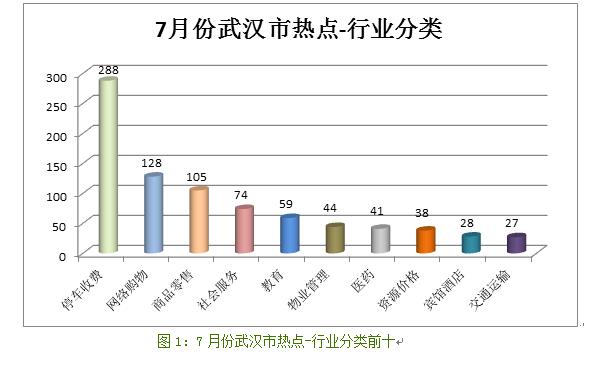 7月全市受理举报量较高的行业分别是停车收费(288件),网络购物(128件),商品零售(105件),社会服务(74件)等。相关情况如图1所示。