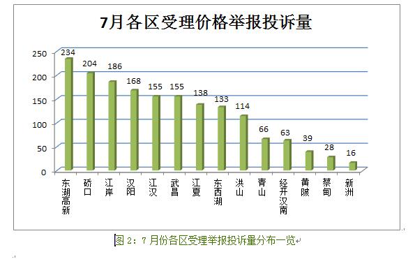 从受理量地域分布情况来看,7月价格举报投诉受理量居前列的各区依次是东湖高新(234件)、硚口(204件)、江岸(186件)、汉阳(168件)、江汉(155件)、武昌(155件) 。