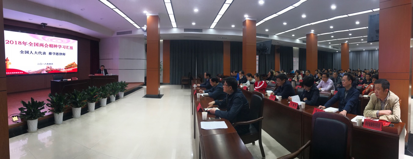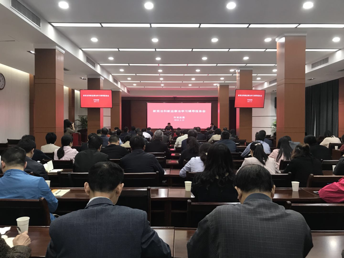 4月13日上午,市发改委举办新宪法和新监察法学习辅导报告会,邀请全国人大代表、市政府法律顾问、著名律师蔡学恩作题为《争当法治中国建设的主力军——2018年全国两会精神解读》的专题辅导报告。委党组中心组成员、机关全体党员干部、委属各单位副处以上干部近200人参加报告会。