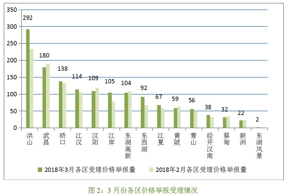 从价格举报受理量地域分布情况来看,居前列的各区依次是:洪山(292件,环比增加25%,下同)、武昌(180件,减少5%)、硚口(138件,增加5%)、江汉(114件,增加8%)、汉阳(109件,减少8%)、江岸(105件,增加35%)。