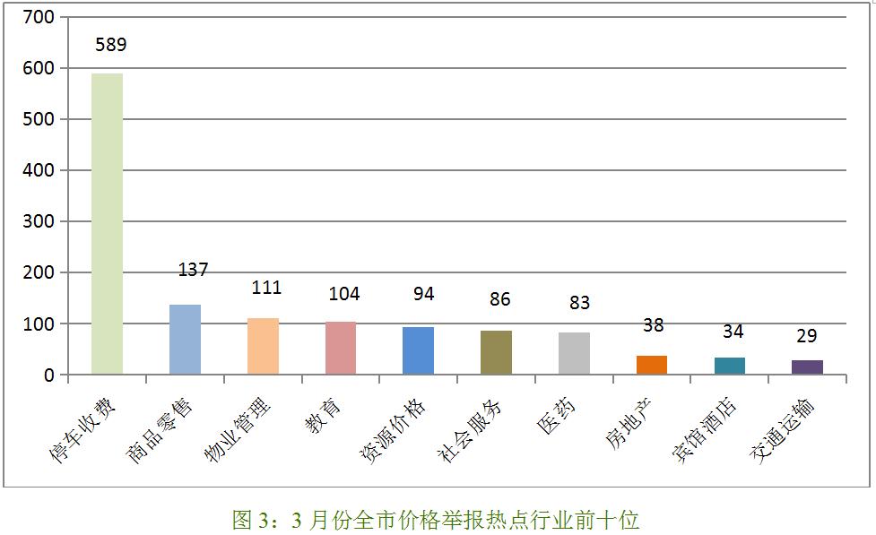 从价格举报热点行业分布情况来看,停车收费、商品零售及物业管理行业依然是全市举报受理量的前三位。值得关注的是,受开学季影响,教育相关举报明显增多。3月份全市共受理教育类举报104件,环比增加247%。其中,幼儿园收费50件,驾校收费32件,其他社会培训机构收费22件。主要是反映幼儿园学费上涨、驾校及其他社会培训机构退费等情况。