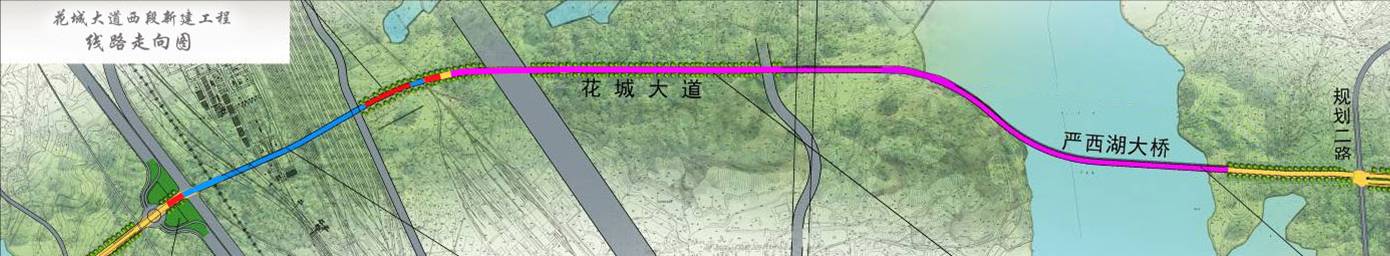 花城大道西段新建工程西起三环线立交平交口,与现状鲁磨路相接,沿线向东依次穿越三环线、王青公路、武东铁路编组站后由鼓架山北侧跨越严西湖后接至花山新城梅城路,道路全长约4.811km。全线含1个互通立交、1座下穿地道、1座大桥。其中武东铁路下穿地道全长约1400m,严西湖大桥长约1323.5m,鼓架山北侧引桥长约1414m;全线道路长度约673.5m。