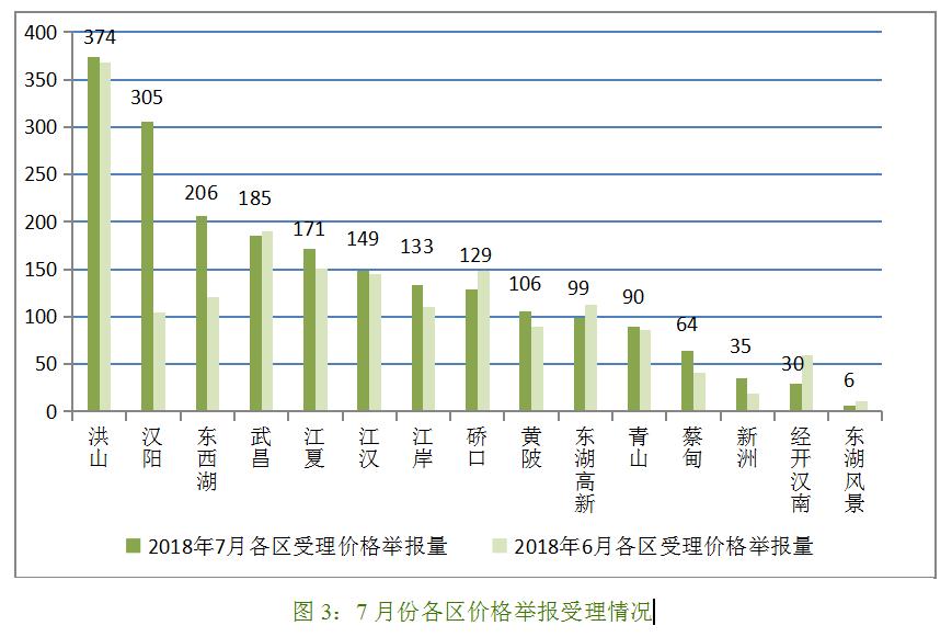 7月份,价格举报受理量居前列的各区依次是:洪山(374件,环比增加2%,下同)、汉阳(305件,增加190%)、东西湖(206件,增加70%)、武昌(185件,减少3%)、江夏(171件,增加13%)、江汉(149件,增加3%)。