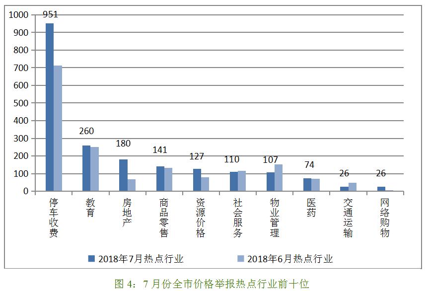 据统计,7月份全市举报受理量前三位依次是停车收费(951件,环比增加34%,下同)、教育收费(260件,增加4%)、房地产(180件,增加165%)。本月停车收费及房地产价格均由于出现集体投诉导致举报量明显上涨,分列热点行业第一和第三位。暑假期间中小学校外培优市场火爆,教育收费举报热度不减,本月依然位于热点行业第二位。