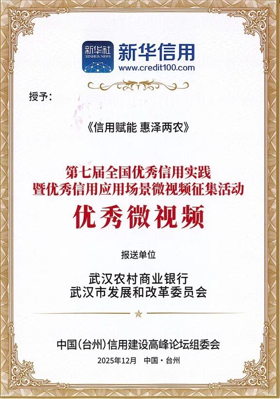 《信用赋能惠泽两农》微视频奖微视频以服务国家乡村振兴战略为核心,聚焦破解“两农”融资难题,通过真实信用贷款案例与科学信用价值模型评估数据,生动展现了武汉农商行 “两农信用贷” 的创新实践。这套适配 “两农” 主体的信用融资解决方案,以信用为纽带,实现兴农惠民的核心目标,在助力农户增收、推动农企壮大、促进乡村产业升级等方面发挥着重要作用,深刻诠释了 “信用即资产,金融暖民心” 的价值理念,展现了武汉地方金融主力军的责任与担当。