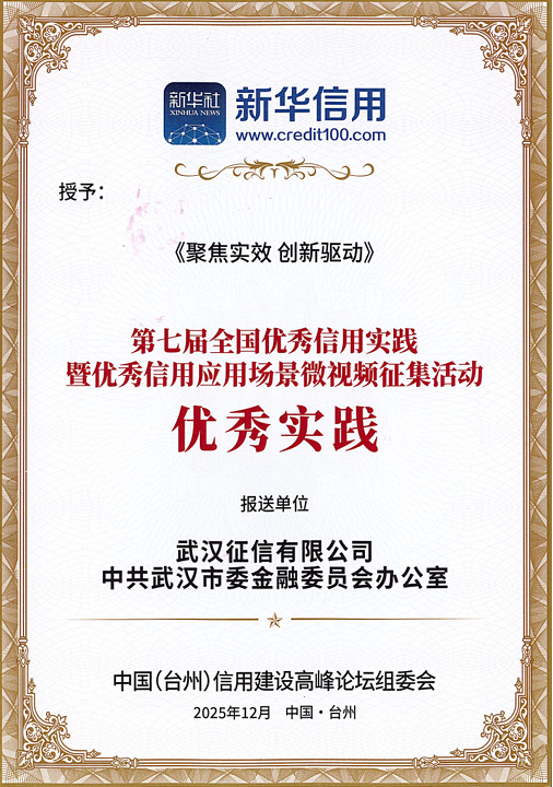 近日,在浙江台州举办的中国城市信用建设高峰论坛上,第七届全国优秀信用实践暨优秀信用应用场景微视频征集活动评选结果正式揭晓。武汉市成功斩获两项殊荣,武汉市农商行报送的《信用赋能惠泽两农》获优秀微视频奖,武汉征信公司报送的《聚焦实效创新驱动》荣获优秀实践奖。