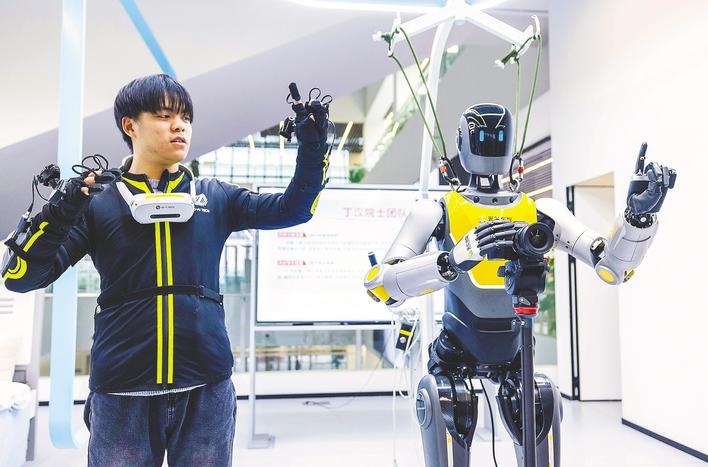 湖北人形机器人创新中心内,人形机器人练习拍照动作。 (湖北日报全媒记者 薛婷 摄)
