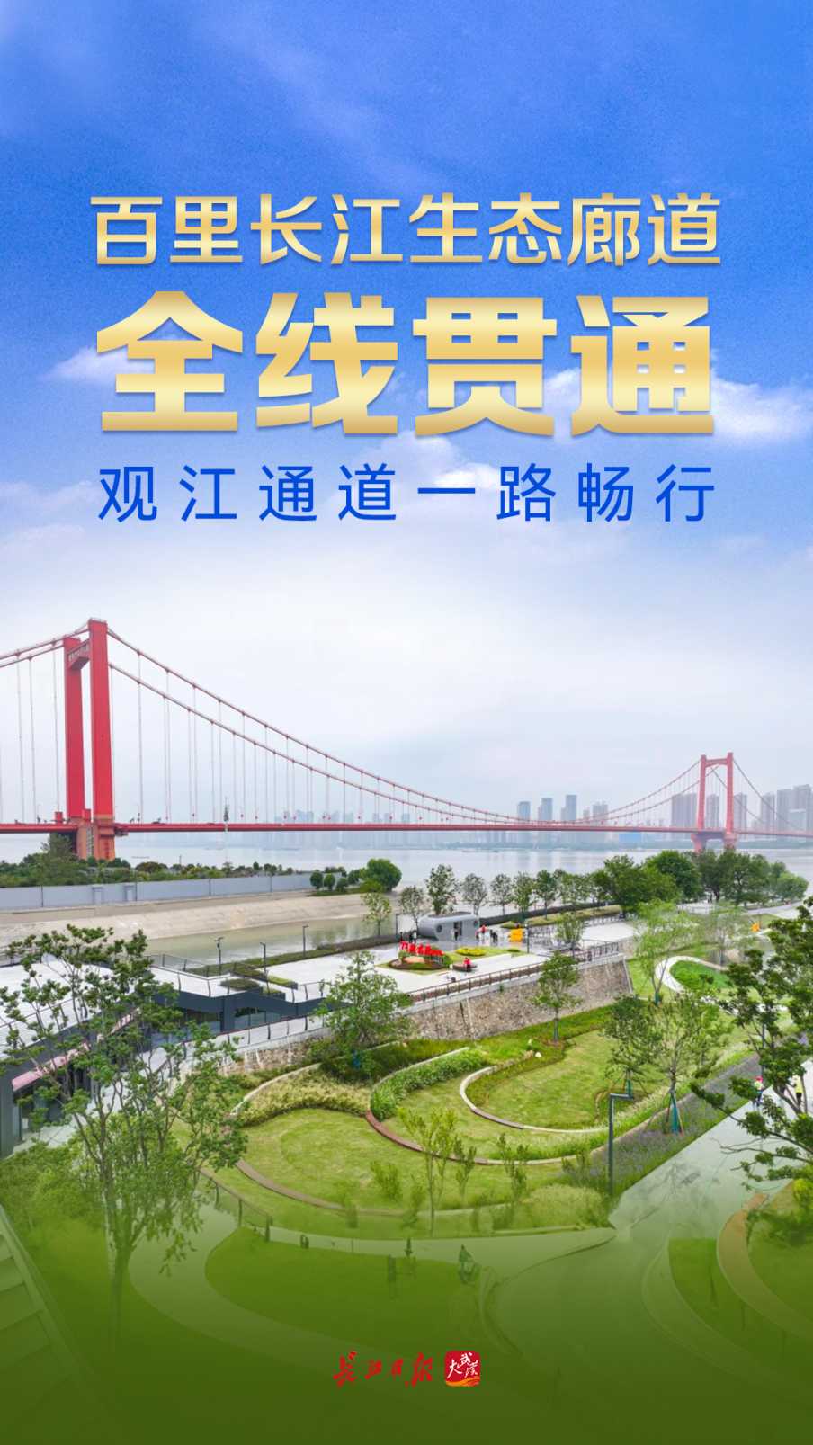 还江于民、还岸于民、还景于民。武汉三环线内长江左、右岸江滩(天兴洲长江大桥至白沙洲长江大桥)及汉江两岸江滩,3条线路呈“人”字形延展于两江四岸,武汉市民有了总长度超80公里的观江通道。