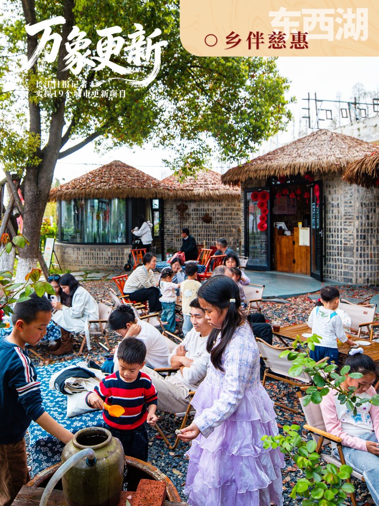 砖红色水塔下,一间闲置农房被唤醒。这座面朝“大海”的小屋,改造成为“右舍·咖啡生活小馆”。昔日渔村变身为深受年轻人喜爱的“城市看海地”与“湖畔慢生活”体验区。